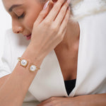 This elegant hinged bangle features a sleek gold-tone finish, highlighted by two oversized faux pearls that sit opposite each other in a bold, minimalist design. The structured bangle hugs the wrist comfortably. The secure clasp makes it easy to wear and remove. Ideal for even broader wrists sizes.