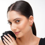 These charming bow earrings feature a polished gold-tone ribbon tied around a vibrant cherry-red bead. Perfect for adding a pop of color!.