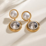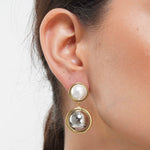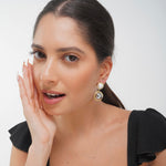The Aurelia Drop Earrings have a soft, pearl-like top and a shiny silver drop, both wrapped in a golden frame. They are light to wear and add a classy touch to any outfit.