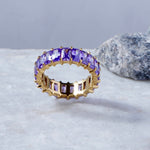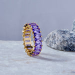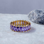 This Amethyst Eternity Band is designed to bring effortless glamour to your everyday style. The ring features a seamless row of vibrant baguette-cut violet stones, set in a radiant gold-plated band. Wear it solo for a pop of color or stack it with your favourites to elevate any look.