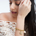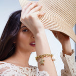 Bring the beach to your wrist with this playful, coastal-inspired piece. Featuring a chunky gold chain and ocean charms like a starfish and smooth white shell, this bracelet captures the spirit of summer. Whether worn solo or stacked, it’s your go-to piece for every beach outfit.