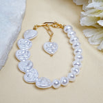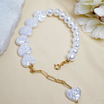 This bracelet features a string of luminous faux pearls paired with sculpted heart-shaped baroque pearls. Detailed with a gold-toned chain and a dangling heart charm, it’s the perfect piece to add a romantic touch to your look. Lightweight and radiant, it transitions effortlessly from day to night.