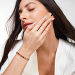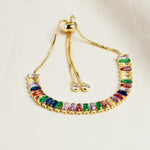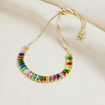 Vibrant and full of joy, this rainbow baguette bracelet is a celebration of color and sparkle. Featuring a row of multi-colored rectangular crystals set in gold tone metal, it adds a playful yet polished touch to any outfit. The adjustable slider clasp ensures a secure and comfortable fit for all wrist sizes. Whether worn solo or stacked, this bracelet is your go-to piece for uplifting everyday looks or brightening up evening attire.