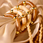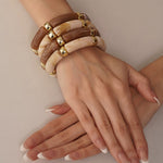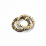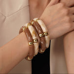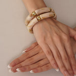 The Moana Stack includes four resin bangles, two in rich brown and two in soft ivory, each finished with gold-plated stainless-steel accents. They're lightweight, stretchable, and easy to slip on due to their expandable elastic design. Wear all four together, mix and match, or style them separately.