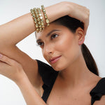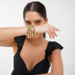This set of 4 chunky, high-shine acrylic bracelets features stunning gold-tone, oversized beads in playful shapes that are lightweight yet eye-catching. Crafted with stretchable elastic, these bangles are free-size and super easy to slip on, offering a comfy fit for all-day wear. Stack them up for maximum glam or wear them solo for a hint of bold touch.