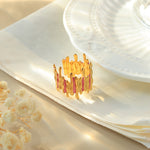 The Strawberry Swirl Ring has fun gold shapes that look like drips, mixed with strawberry pink. It’s bright, playful, and adds a sweet pop of color to your look. Great to wear
